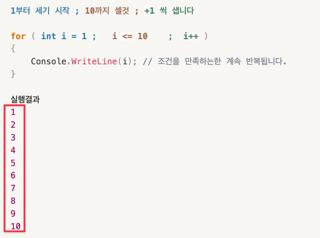 설명 -  for문의 {} 안에 들어가 있는 내용은 계속해서 반복 실행됩니다.