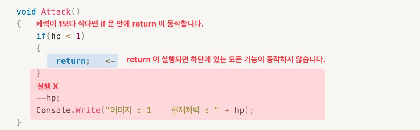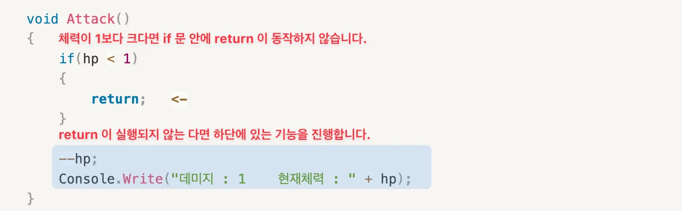이렇게 공격할 때마다 계속 체력이 감소한다면 체력이 0 일 때 공격하더라도 체력은 - 로 계속 감소될 것입니다.