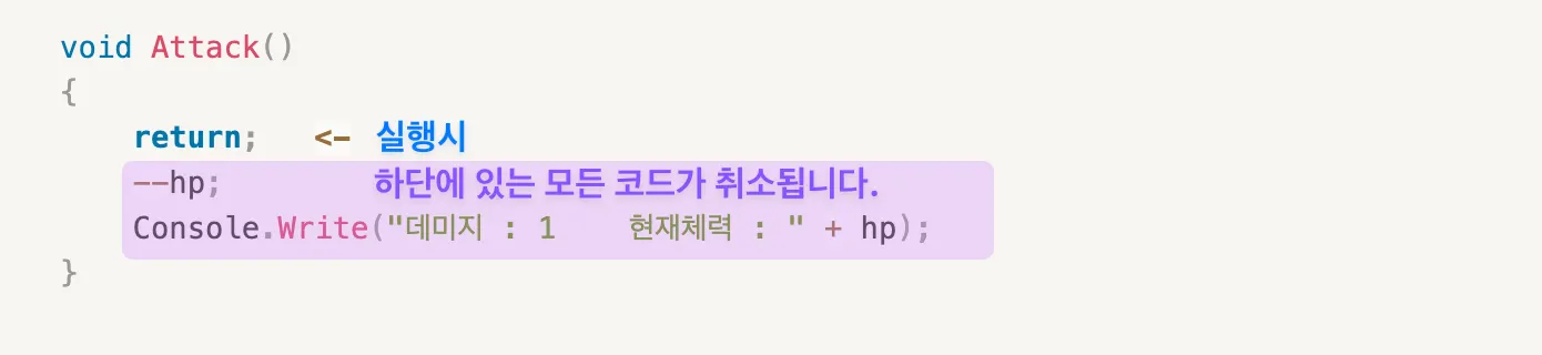 return 은 해당 코드 밑에 있는 모든 기능을 캔슬하고 함수를 종료합니다.