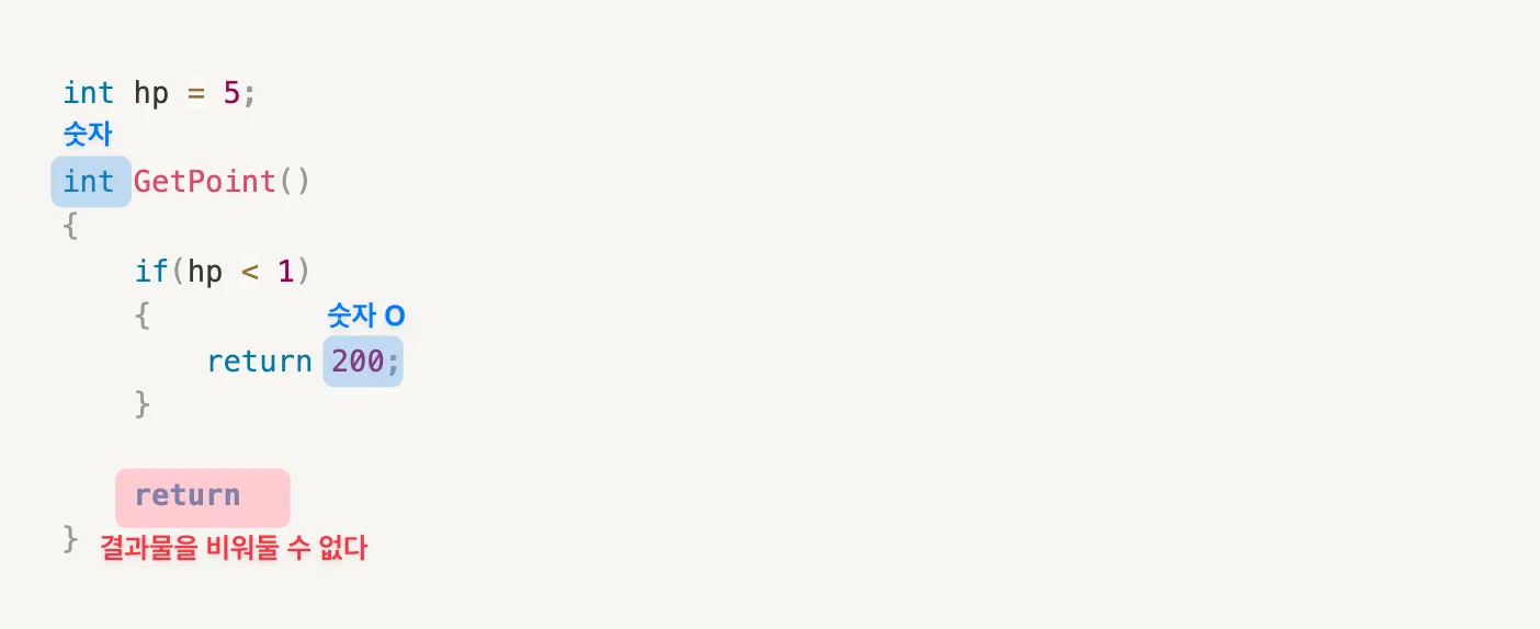 따라서 if 문 조건이 안되더라도 기본적으로 실행될 return 을 준비해두어야 합니다.