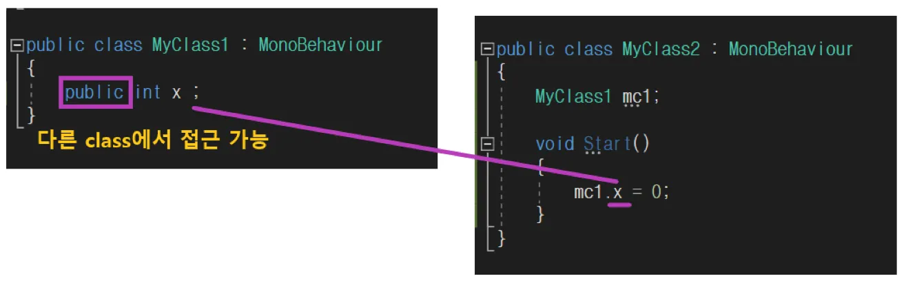 클래스에서 public 로 선언된 변수는 외부 클래스에서 접근할 수 있습니다.