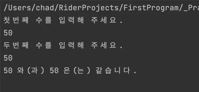 첫번째 수와 두번째 수가 같다면 - ”xx 와(과) xx 은(는) 같습니다.”