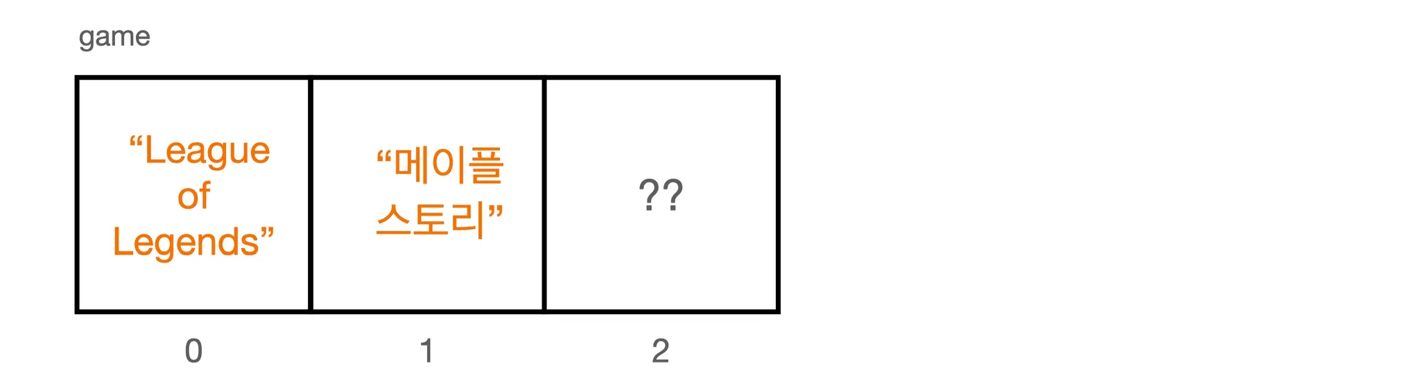 문자 3개가 저장가능한 game 배열에 2개까지 데이터를 저장하고 출력시 다음과 같이 표시됩니다.