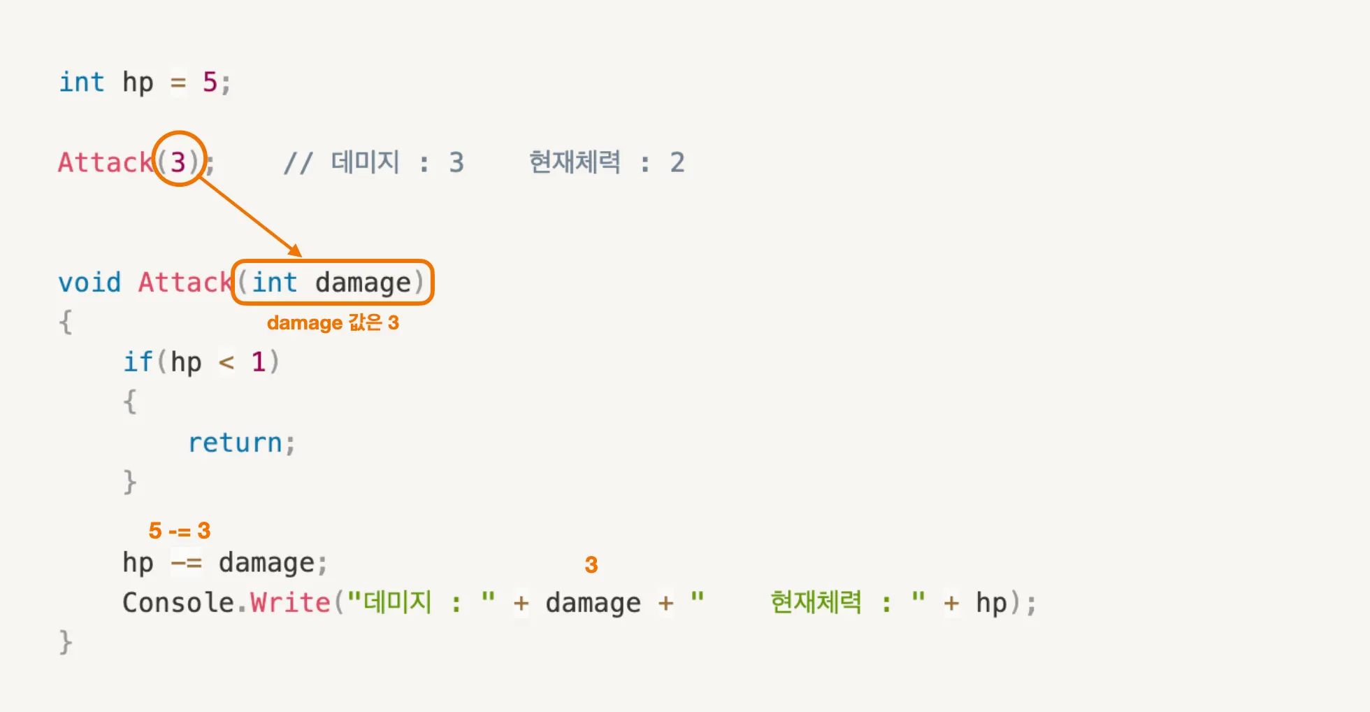 이렇게 중괄호에서 만들어져 실행할때마다 다르게 동작할수 있는 변수를 매개변수 라고 합니다.