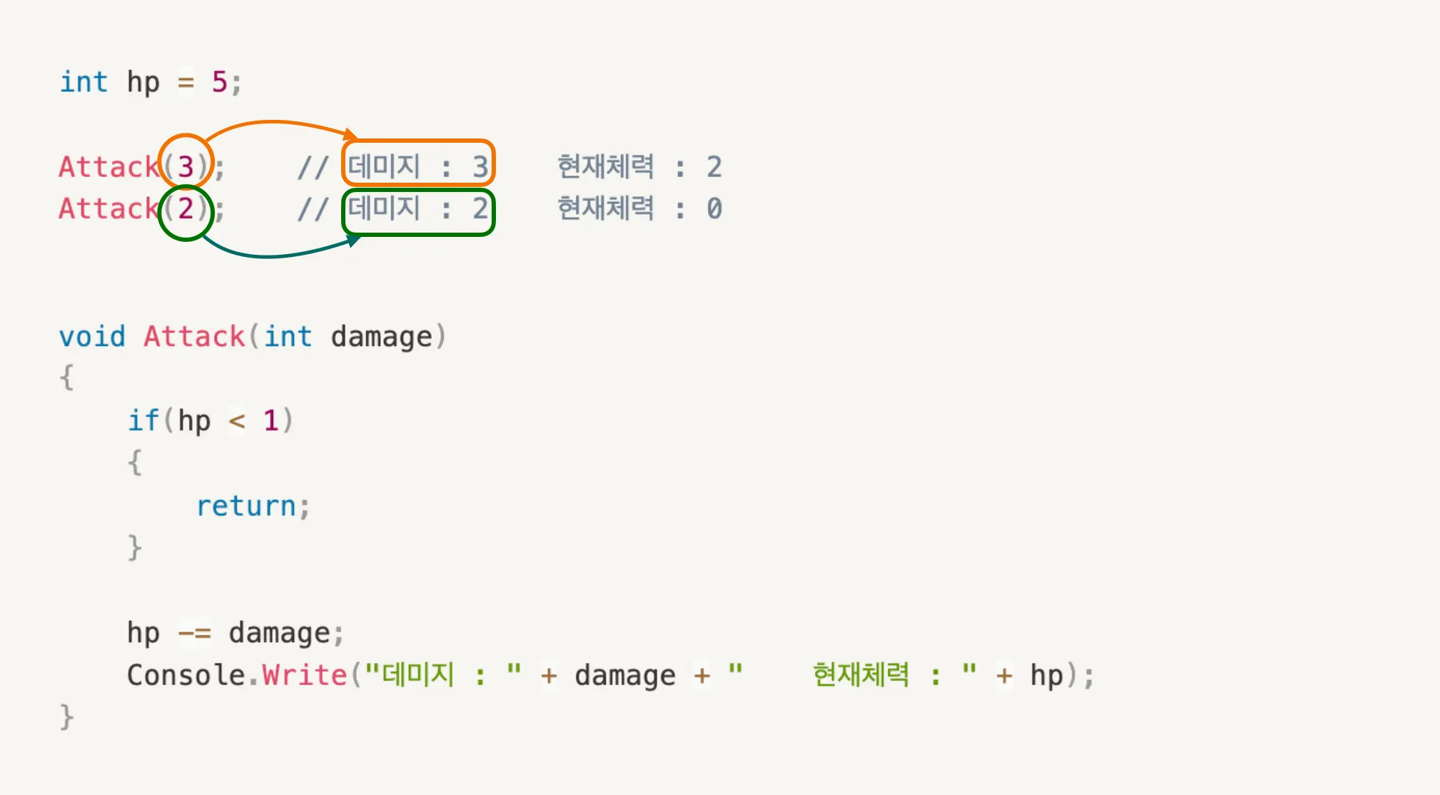 Console.Write("데미지 : 1    현재체력 : " + hp);
