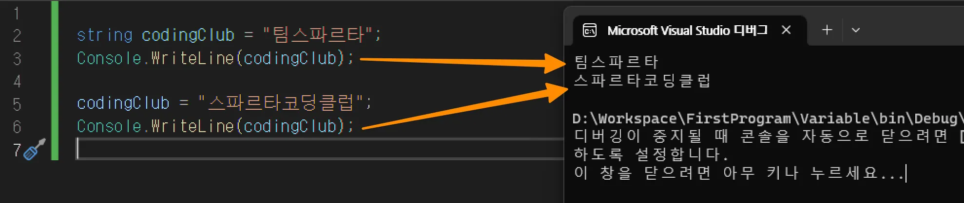 2번째 줄에서 codingClub 이라는 변수를 만들고 “팀스파르타” 라는 값을 저장했습니다.