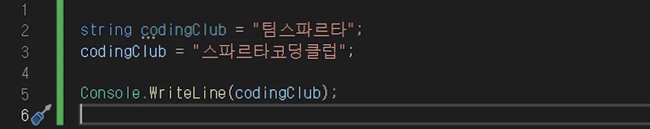 3번째 줄에서 이미 만들어진 codingClub 변수에 “스파르타코딩클럽” 이라는 값으로 다시 저장했습니다.