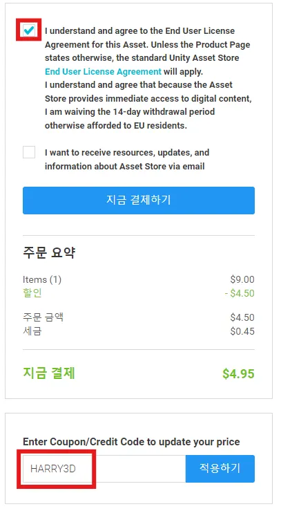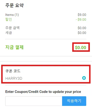 쿠폰 적용을 완료하면 주문 합계가 $0.00으로 출력됩니다.