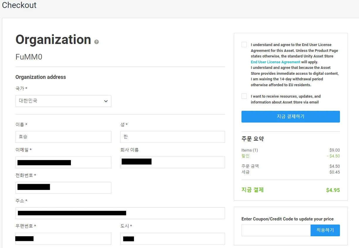 개인정보 입력 후, 우측 하단 쿠폰 코드 입력 칸에 3번에서 복사한 쿠폰 코드를 붙여 넣어 적용해주세요.