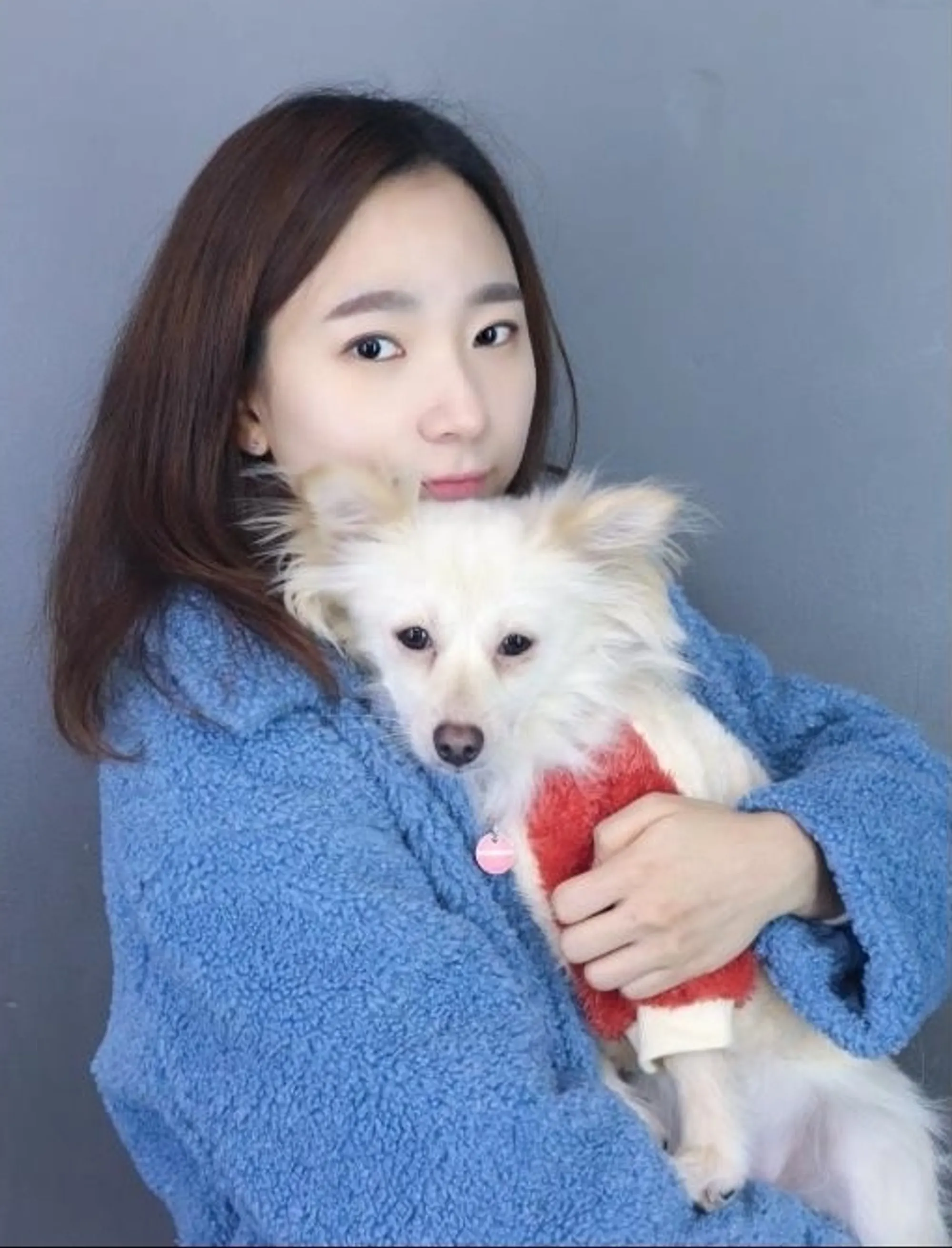 저는 2살 강아지랑 같이 있는 걸 가장 좋아하는데요, 지금도 제 뒤에서 자고 있어요!